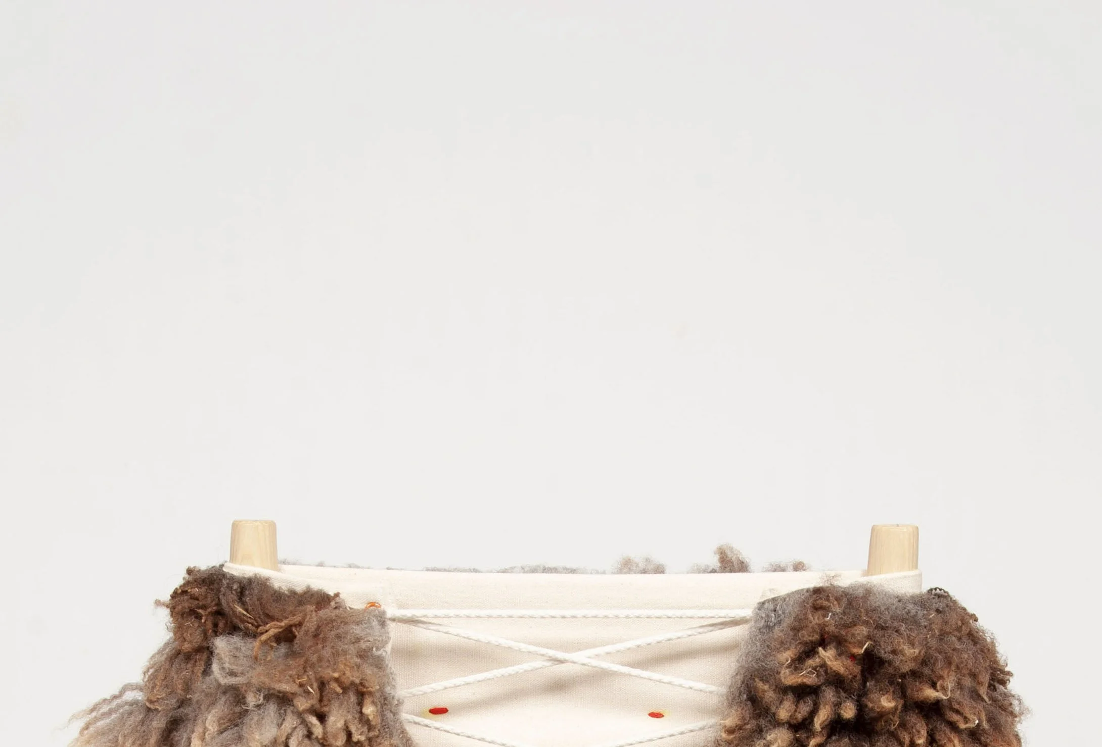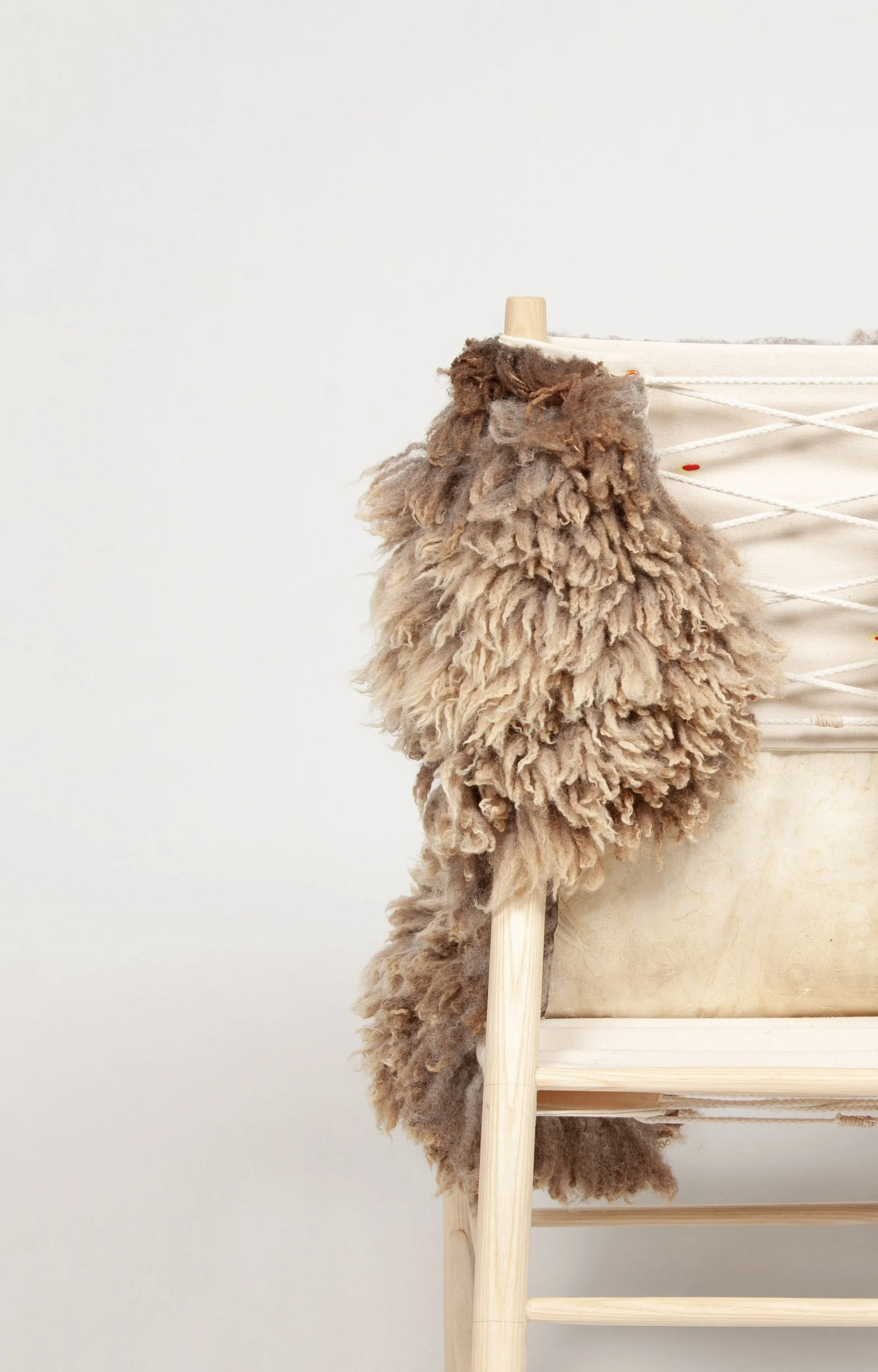 The Lounging Post and Rung reinterprets post and rung chairs, drawing on Jennie Alexander’s reclaimed riving and joinery techniques. Made from ash, the curved back legs break from the chair’s traditional rigidity to create an inviting, sculptural form. The hide was alum tanned and connected to corseted canvas. This work illustrates connecting material traditions, redefining utility as an expressive, contemplative experience. Created in 2023, it continues evolving through mentorship and prototyping.